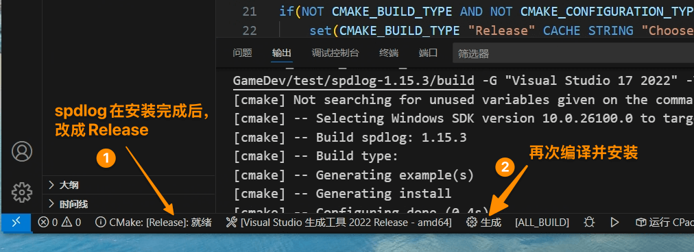 spdlog的debug和release模式需要分别编译安装,默认是debug模式,如果要支持release,在debug安装完成之后,改成release重新安装一次即可(即一共安装两次)