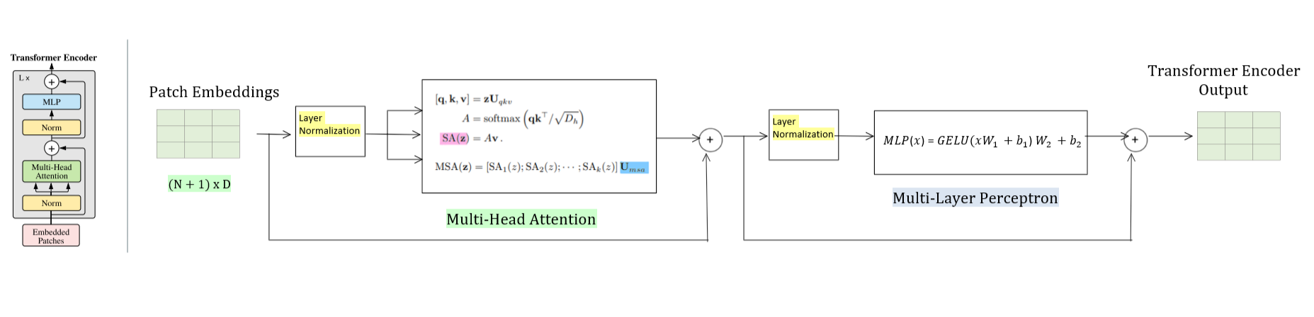 The Transformer Encoder is composed of two main layers: Multi-Head Self-Attention and Multi-Layer Perceptron. Before passing patch embeddings through these two layers, we apply Layer Normalization and right after passing embeddings through both layers, we apply Residual Connection.