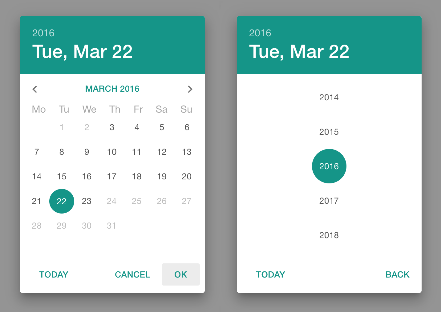This module is a simple date picker for those who writes project with Angular Material and wants an alternative date picker to the standard one. It built with Angular Material and Moment.js. Design was inspired by Google Material Design specifications.